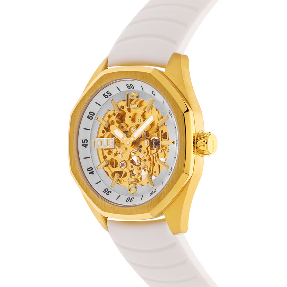 Reloj analógico automático con caja de acero IPG dorado y brazalete de silicona blanca TOUS Now