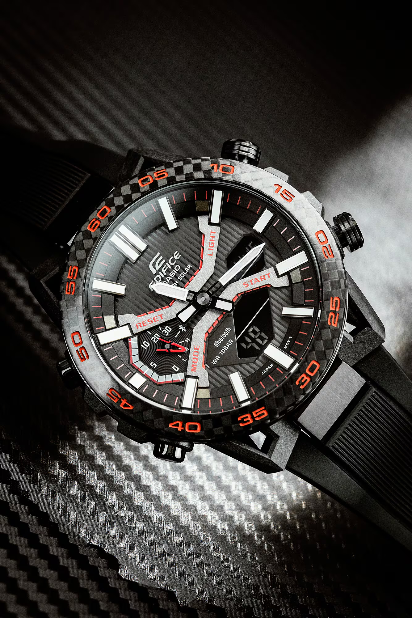 Tome el control de la velocidad y la inteligencia con la combinación analógica-digital del EDIFICE solar. Inspirado en la suspensión de los coches de fórmula 1, el SOSPENSIONE ECB-2000 es el primer EDIFICE dotado de una caja de resina reforzada con fibra de carbono, con un diseño de caja único que distribuye las orejetas en una composición de cuatro ejes. Las orejetas están reforzadas con fibra de carbono, confiriendo el verdadero espíritu de los deportes de motor tanto al diseño como a los materiales de este reloj. Es muy fácil de sincronizar con su smartphone a través de Bluetooth®. Acceda a la aplicación específica para consultar los tiempos con una precisión al segundo, tan importante para los equipos de carreras, y para gestionar sin esfuerzo la hora mundial y transferir los datos del cronómetro medidos al milisegundo a su smartphone. La luz LED (superiluminador) hace que la visualización de la esfera analógica-digital no sea un problema, y el sistema Tough Solar lo mantiene cargado y en funcionamiento incluso con funciones de alta demanda con sólo una pequeña cantidad de luz.