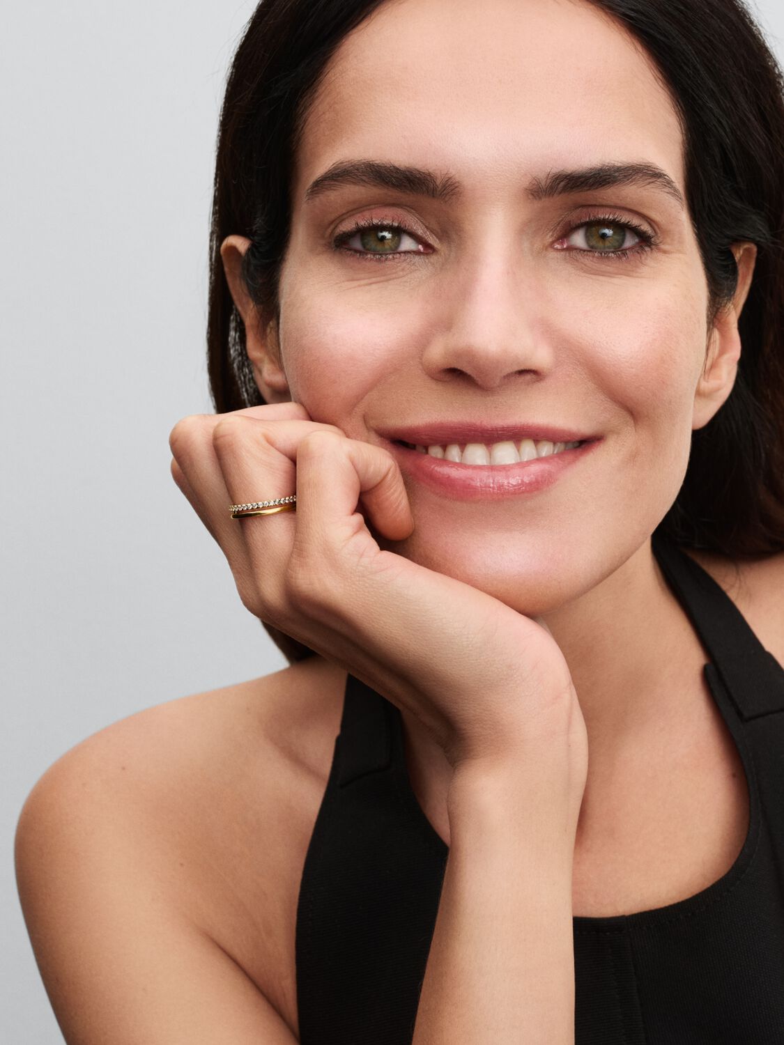 Un diseño audaz y delicado, esta doble banda conectada combina el brillo del pulido con el brillo del pavé. Una joya que combina texturas en un diseño que la hará destacar en cualquier colección de joyas.