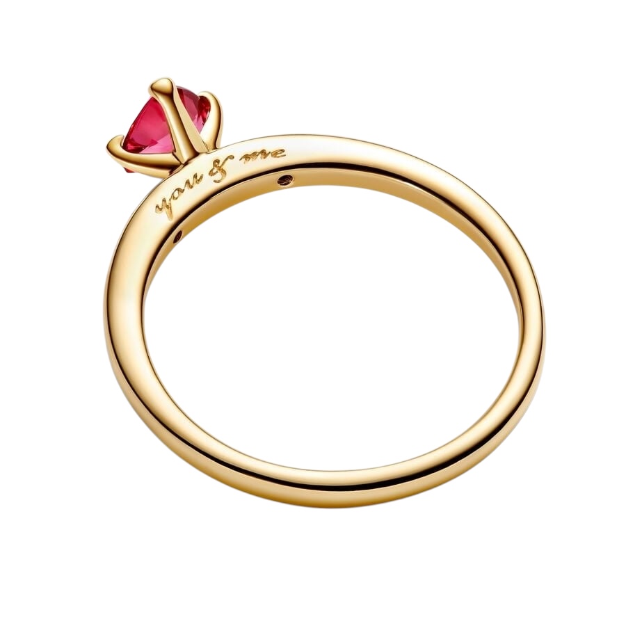 Qué tiene que ver el amor con esto? Todo. Inspirado en el espíritu del Día de San Valentín, este romántico anillo captura la esencia del afecto y los gestos cargados de sentimiento. Este anillo especial con un recubrimiento de oro de 14k se ha decorado con un cristal artificial de color rojo con talla con forma de corazón y engastes en garras y se ha enmarcado con dos circonitas cúbicas engastadas a nivel. El mensaje «you & me» (tú y yo, en español) grabado en el eje del anillo le aporta un toque extra personal, haciendo que sea un regalo perfecto para alguien especial.