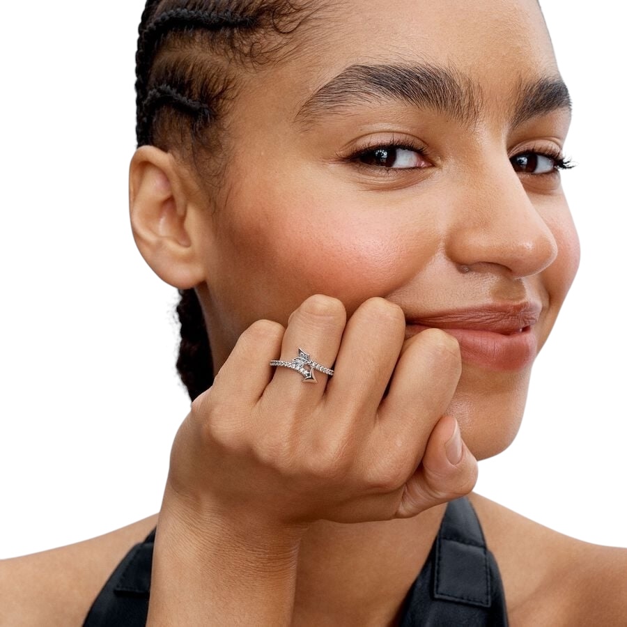 ¿Estás perdidamente enamorada o enamorado? El Anillo Flecha Brillante creado en plata de primera ley se presenta con el llamativo motivo de la flecha de Cupido. El eje, decorado con pavé hasta la mitad, imita elegantemente la forma de la flecha completa con la punta pulida y el astil curvado. Combínalo con otros anillos minimalistas para crear un look moderno o póntelo solo como joya de impacto con un sutil simbolismo.