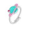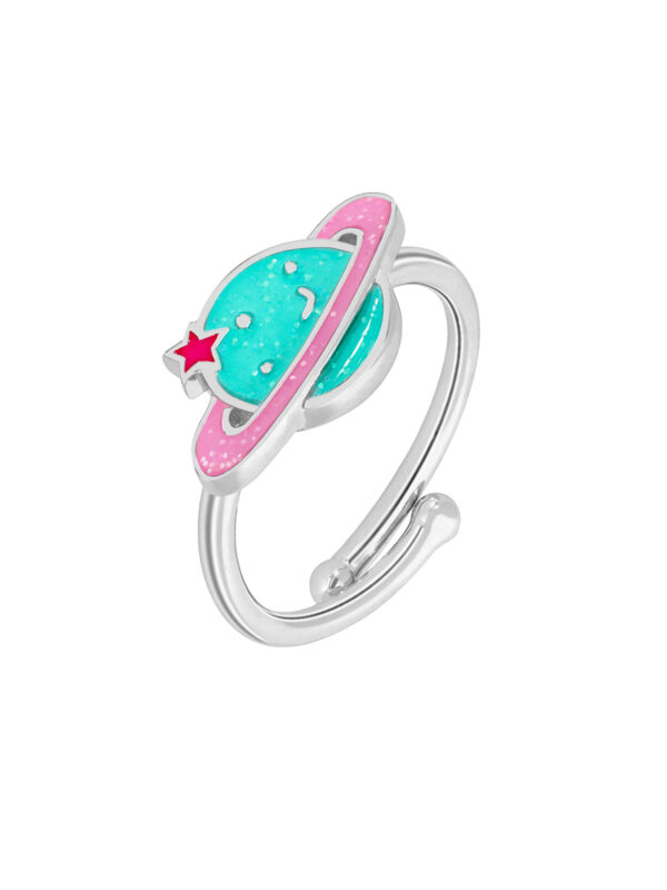 Anillo planeta. Plata de 1ª Ley rodiada. Esmalte rosa y turquesa. Detalles con purpurina. Talla adaptable. Colección girls.