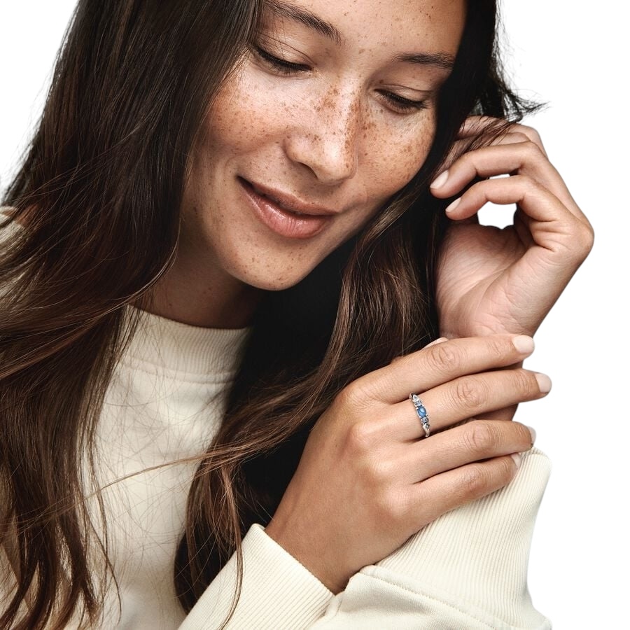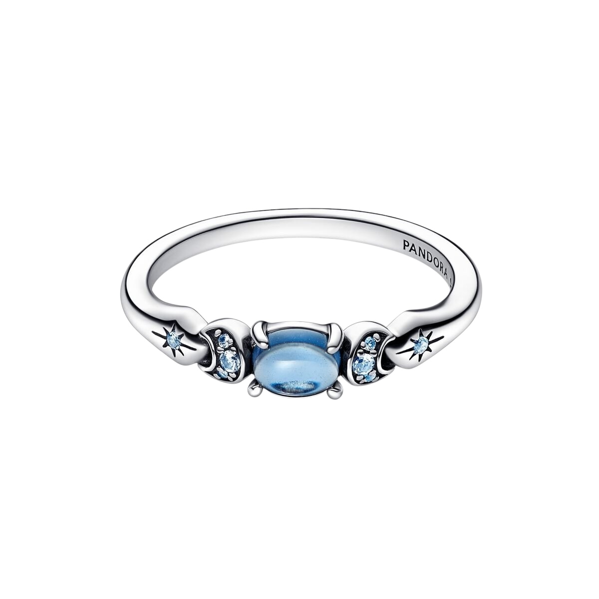 Combina tus historias favoritas con Disney x Pandora. Celebra el 30 aniversario del clásico de Disney, Aladdin, con joyas inspiradas en la Princesa Jasmine, valiente y segura de sí misma. Elaborado en plata de ley, este anillo se presenta con un cristal sintético ovalado de color azul lunar en el centro, rodeado de cristales sintéticos de color azul glacial que hacen referencia al característico color azul turquesa de la Princesa Jasmine. Haz que tus deseos se hagan realidad y pon este anillo de plata de ley entre tus favoritos de todos los días para que tu valentía brille a la vista de todos, o regálaselo a una fan de Aladdin y lleva sus joyas a un nuevo mundo.