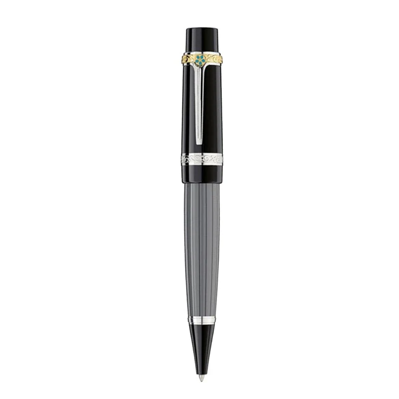 Con esta Edición Limitada, Montblanc rinde tributo a Honoré de Balzac a través de un artículo de escritura tan extraordinario como el escritor. El diseño y la forma evocan a la perfección la prestancia y la elegancia al vestir de Balzac, como se aprecia en la contera que reproduce los zapatos de punta fina que usaba el escritor. El capuchón de resina preciosa negra y el depósito gris decorado con finas líneas son un homenaje al “chaqué” – una prenda esencial en el guardarropa de Balzac. El escritor solía usar un bastón suntuosamente decorado, que se vislumbra en el clip de platino con incrustación de turquesa. Las iniciales de Balzac grabadas en tipografía realzan delicadamente el plumín de oro 750 parcialmente rodiado de la Edición de Escritores, evocando al autor, impresor y editor que era Balzac. Una de las principales características de esta Edición Limitada son los tres anillos que representan la estructura de clases de Francia en el siglo XIX, descrita de manera brillante en su obra maestra «La Comedia humana»: opulento anillo dorado de la caperuza del capuchón representa la nobleza, el anillo platinado sutilmente decorado representa la burguesía y en sencillo anillo de la contera simboliza estrato más bajo.
