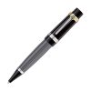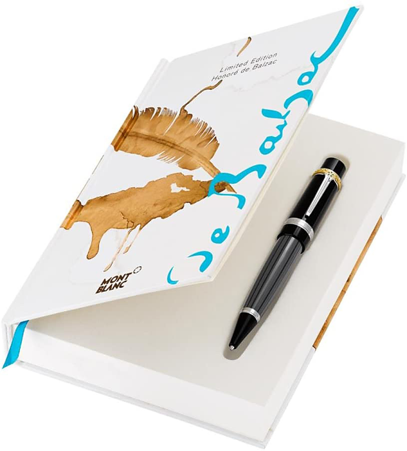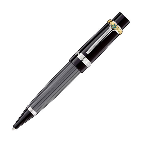 Inspirada en el dandismo del siglo XIX y la elegancia de Balzac, la preciosa resina es negra. Barril con laca gris y refinamiento de guilloché. Clip con lacado turquesa y anillos recubiertos de platino y oro.