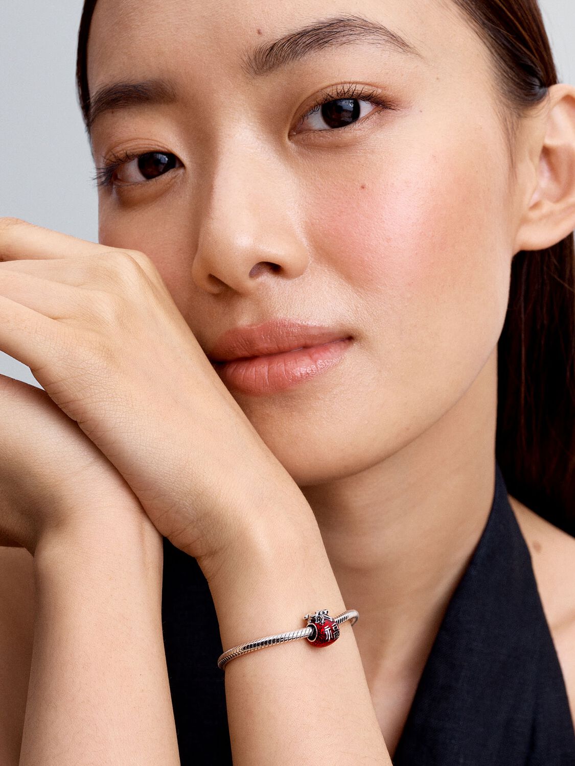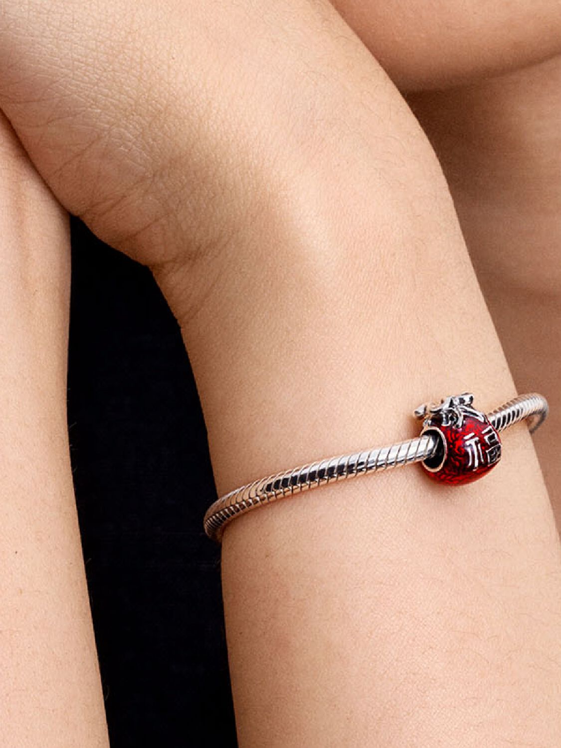 Lleva la buena suerte allá donde vayas. Esta bolsa de plata de primera ley se presenta esmaltada en color rojo y se ha decorado con el carácter chino Fu en ambos lados, que simboliza la felicidad y la buena suerte.