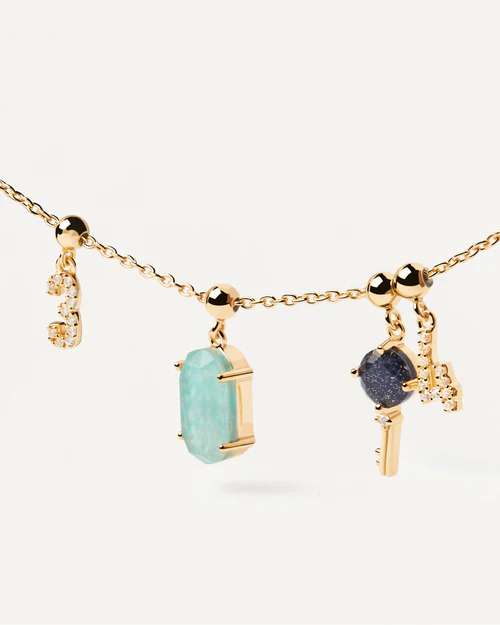 Los Charms de Piedras están realizados en plata de ley con un baño de oro de 18K y adornados con hermosas piedras semipreciosas como la labradorita, la amazonita o el nácar. Elige tus piedras y abraza sus propiedades: suerte, fuerza, calma, intuición y transformación. Tonalidades magnéticas llenas de significados magnéticos.