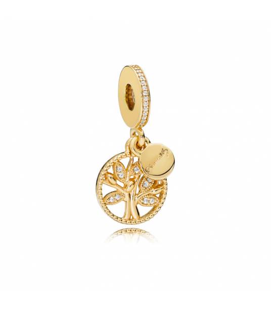 Charm Colgante Árbol Genealógico Brillante para los brazaletes de Pandora Moments representa la conexión que las familias comparten a través de generaciones. El intrincado diseño recubierto de oro de 14 K tiene la forma de un árbol genealógico adornado con circonita cúbica brillante. El disco en miniatura está apropiadamente grabado con la palabra «Family» (Familia).