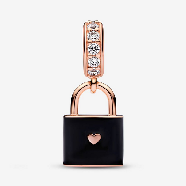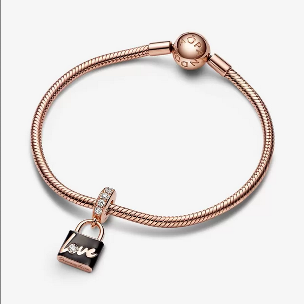 Celebra tu amor infinito con nuestro Charm Colgante Candado Amor. Este candado con un recubrimiento electrolítico de oro rosa de 14k se presenta acabado a mano con esmalte de color negro, que hace destacar la inscripción pulida en relieve del anverso y el corazón del reverso. La inscripción dice «Love» (Amor) y en esta inscripción, una circonita cúbica transparente sustituye a la «o» que hace juego con el brillante pavé de la anilla. En la parte inferior del candado se puede leer la inscripción «Precious to me» (Precioso para mí). Por favor, recuerda que el candado no se puede abrir, por ello simboliza el fuerte vínculo del amor.