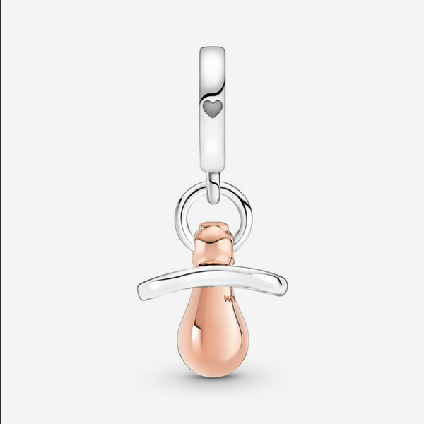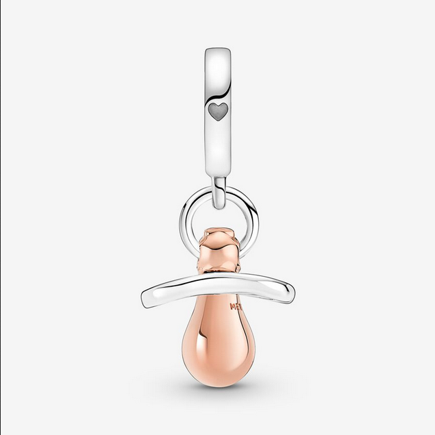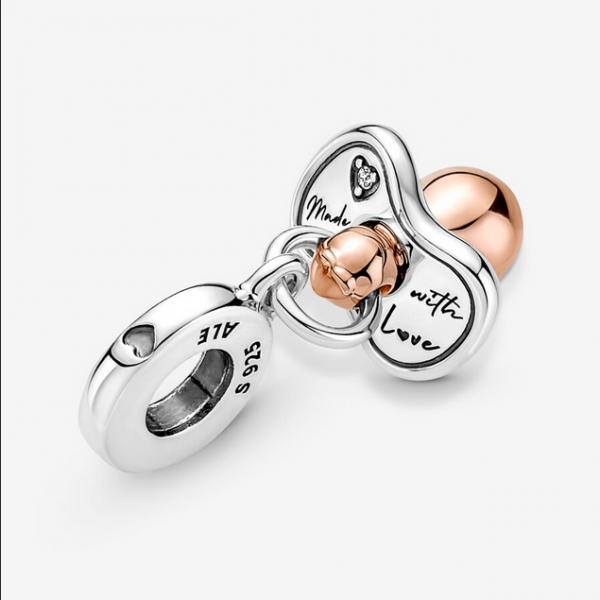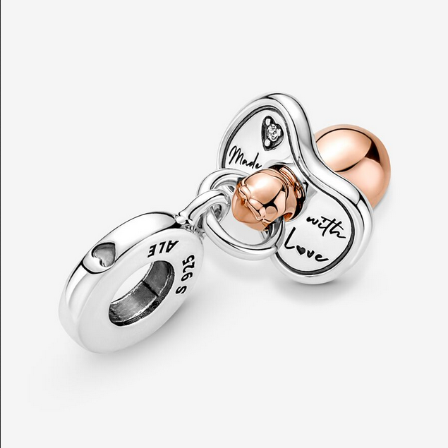 Charm Colgante Chupete Bebé. El chupete se presenta con un recubrimiento electrolítico de oro rosa de segunda ley de 14k con circonitas cúbicas engastadas en pavé formando un corazón. El protector del chupete de plata de primera ley se ha embellecido con una gema y la inscripción: «Made with love» (Hecho con amor). Este es sin duda un regalo muy significativo para cualquier madre orgullosa.