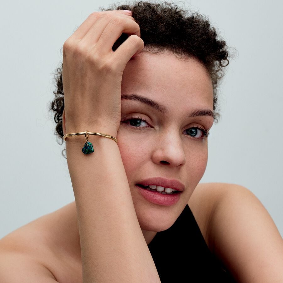 Lleva el corazón de la jungla con el Charm Colgante Corazón Verde Opalescente. Un ópalo iridiscente creado en laboratorio con forma de corazón presenta un espectro de colores y rayas brillantes diseñados para evocar los vibrantes colores del trópico. El corazón cuelga en ángulo de un aro con un recubrimiento en oro de 14k y una anilla con forma de pera. Combina este llamativo charm con otros diseños en un tono cálido para crear un punto focal y para recordarte la energía salvaje y libre de la naturaleza y el verano.