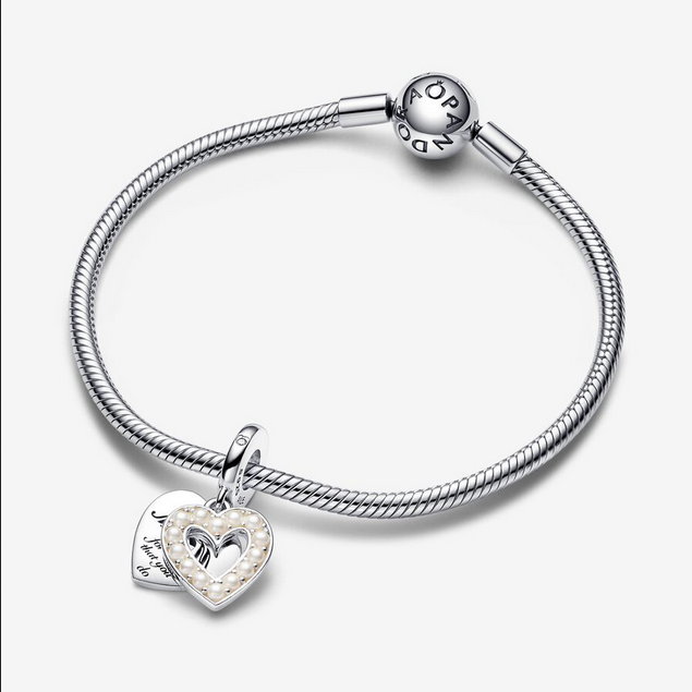 Un elegante regalo para una madre que ama los tonos nacarados. El Charm Colgante Doble Corazón Blanco Anacarado está elaborado en plata de ley y presenta un corazón recortado adornado con una hilera de madreperla artificial de bioresina. Detrás de este hay otro disco en forma de corazón con la inscripción «Thanks M❤M for all that you do» (Gracias Mamá por todo lo que haces), con un corazón recortado en el centro que forma la letra central de la palabra «M❤M» (Mamá). Rinde homenaje a la figura materna de tu vida con una joya que exprese tu gratitud por todo su amor y cuidados.