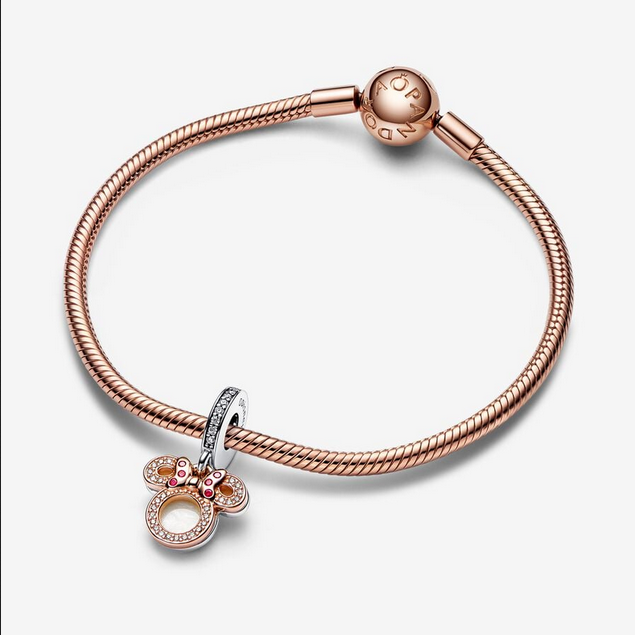 Rinde homenaje a tu madre, tu mejor amiga, con Minnie Mouse de Disney. El Charm Colgante Doble Silueta Minnie Mouse de Disney tiene dos discos con la forma de la icónica de la cabeza de Minnie Mouse, en la parte anterior presenta una silueta calada con recubrimiento en oro rosa de segunda ley de 14k, engastada en brillante pavé transparente y acabado con el lazo de Minnie con circonitas cúbicas de color rojo. En la parte posterior hay un colgante en plata de ley con la inscripción «Mum you are my best friend» (Mamá eres mi mejor amiga) y la silueta recortada de Minnie Mouse como representación de la «u» en Mum, mientras que el otro lado está adornado con esmalte brillante de color blanco. Una dulce sorpresa para una madre a la que le encanta Disney, para agradecerle todas las risas, el amor y los momentos especiales que compartís.