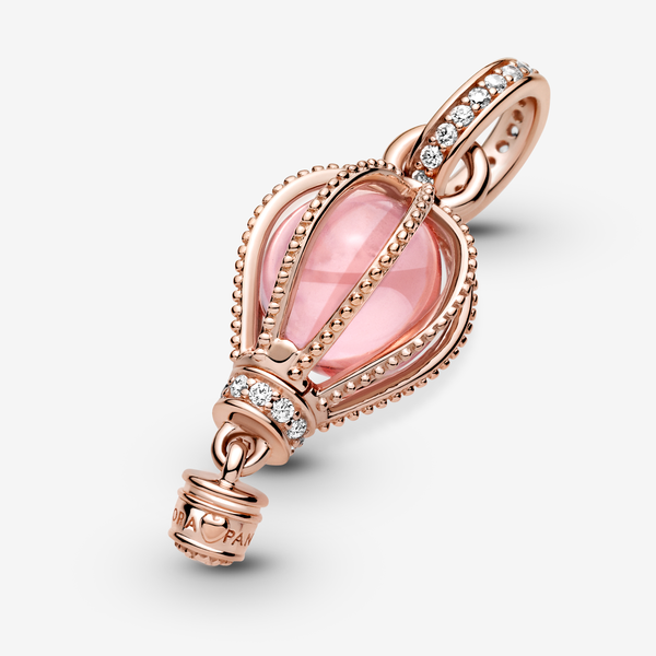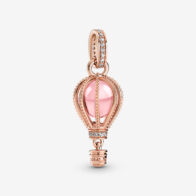 Charm Colgante Globo Aerostático Rosa Brillante. Este charm en tonos cálidos está acabado a mano en Pandora Rose (una aleación única de metales con un recubrimiento de oro de segunda ley de 14K). El charm presenta un cristal de color rosa rodeado por cuerdas de esferas embellecidas con circonitas cúbicas brillantes transparentes. La anilla y la base del globo se han decorado con pavé brillante.