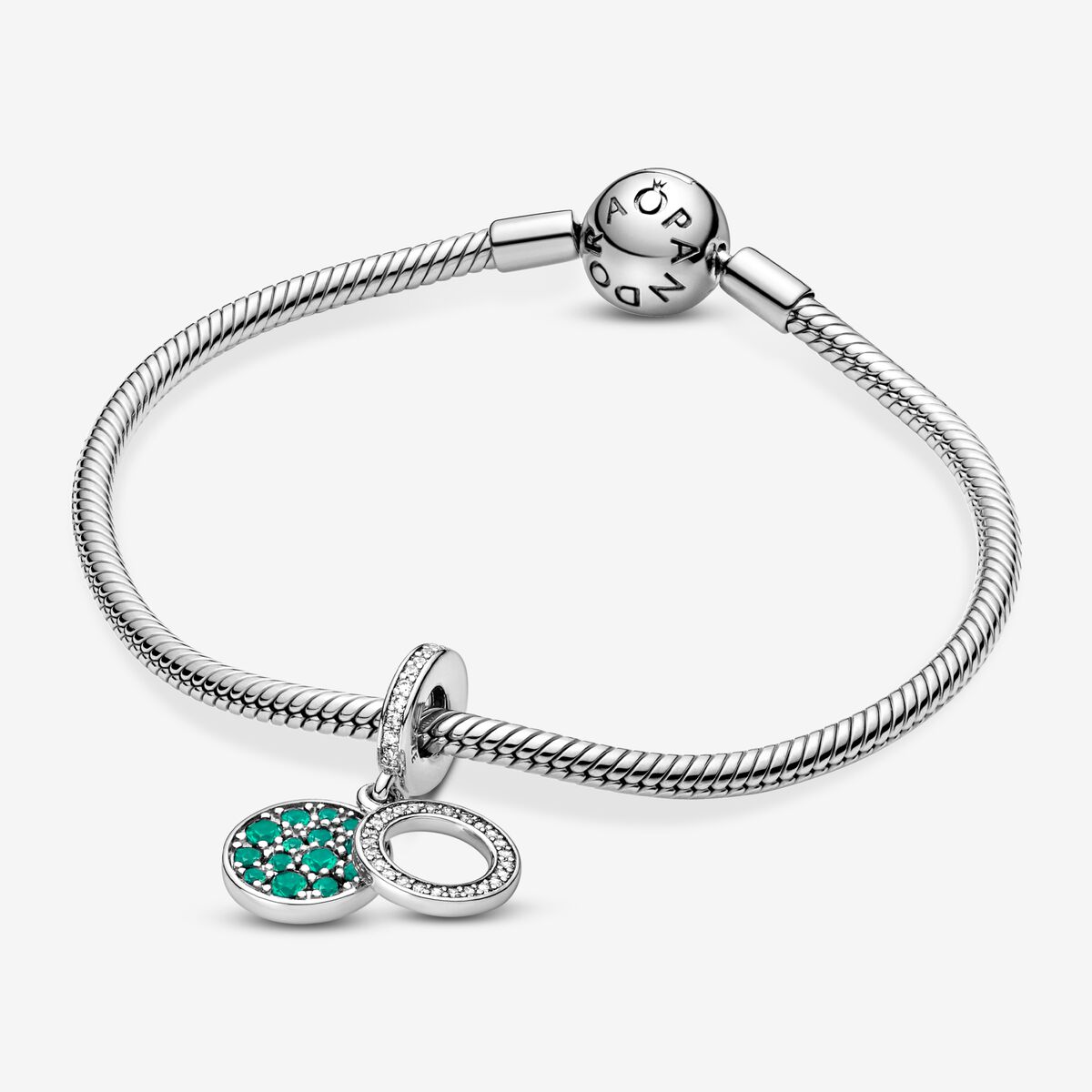 Da un toque de color a tu colección con el Charm Colgante Doble Disco Verde Brillante. Acabado a mano en plata de primera ley, este diseño incluye un disco decorado con esferas y gemas en color verde de varios tamaños. El reverso del disco se presenta adornado con el logotipo de Pandora y el monograma de la O con la corona de Pandora. El círculo frontal se ha embellecido con circonitas cúbicas transparentes para crear contraste. Lleva esta joya con otros charms de color en tu pulsera de Pandora Moments para darle un aire encantador.
