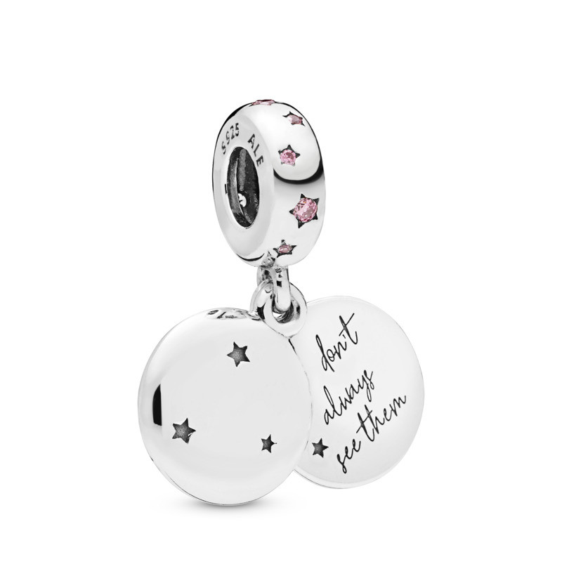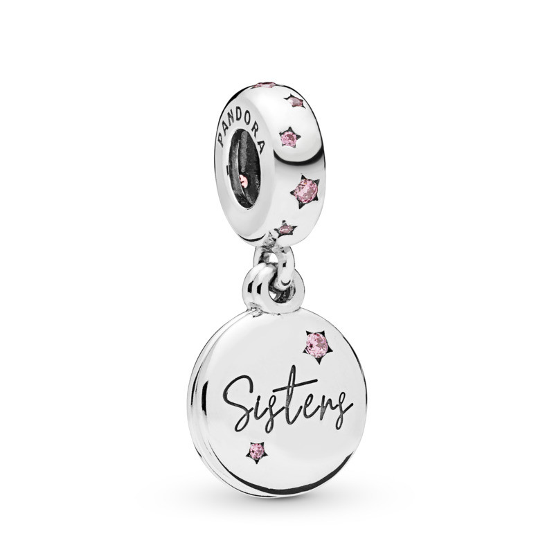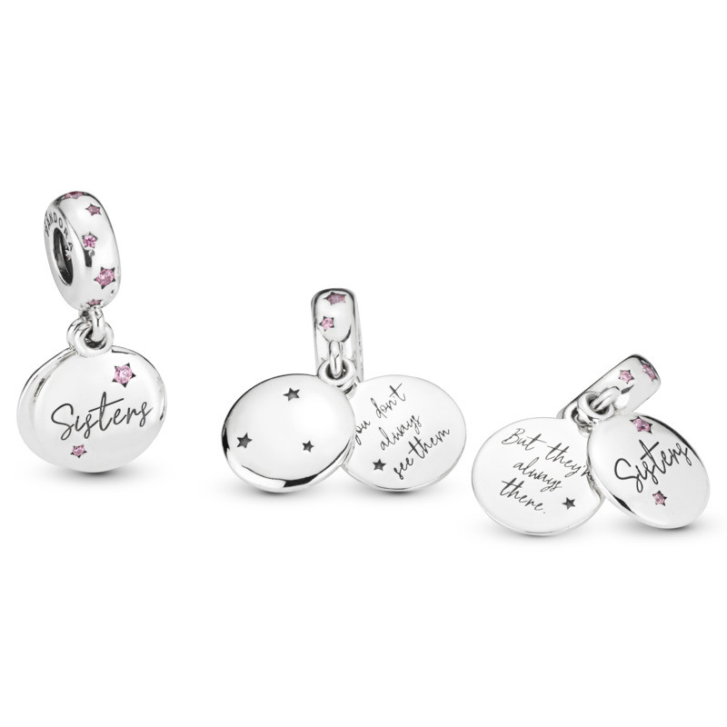 Charm colgante en plata de ley hermanas para siempre con estrellas circonitas fucsias y grabados «sisters» «you don´t always see them» y «But they´re always there»