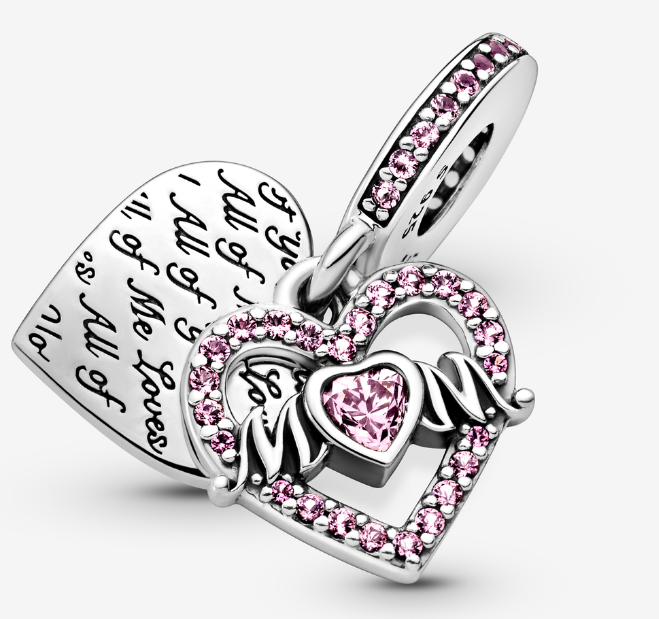 Acabado a mano en plata de primera ley, el disco delantero con forma de corazón presenta todo su contorno perfilado con cristales de color rosa y la inscripción “Mum” (Mamá) donde la “U” se ha sustituido por un corazón embellecido con una gema a juego. El disco trasero con forma de corazón se ha embellecido con un patrón repetitivo de la inscripción “All of me loves all of you” (Te amo como eres).