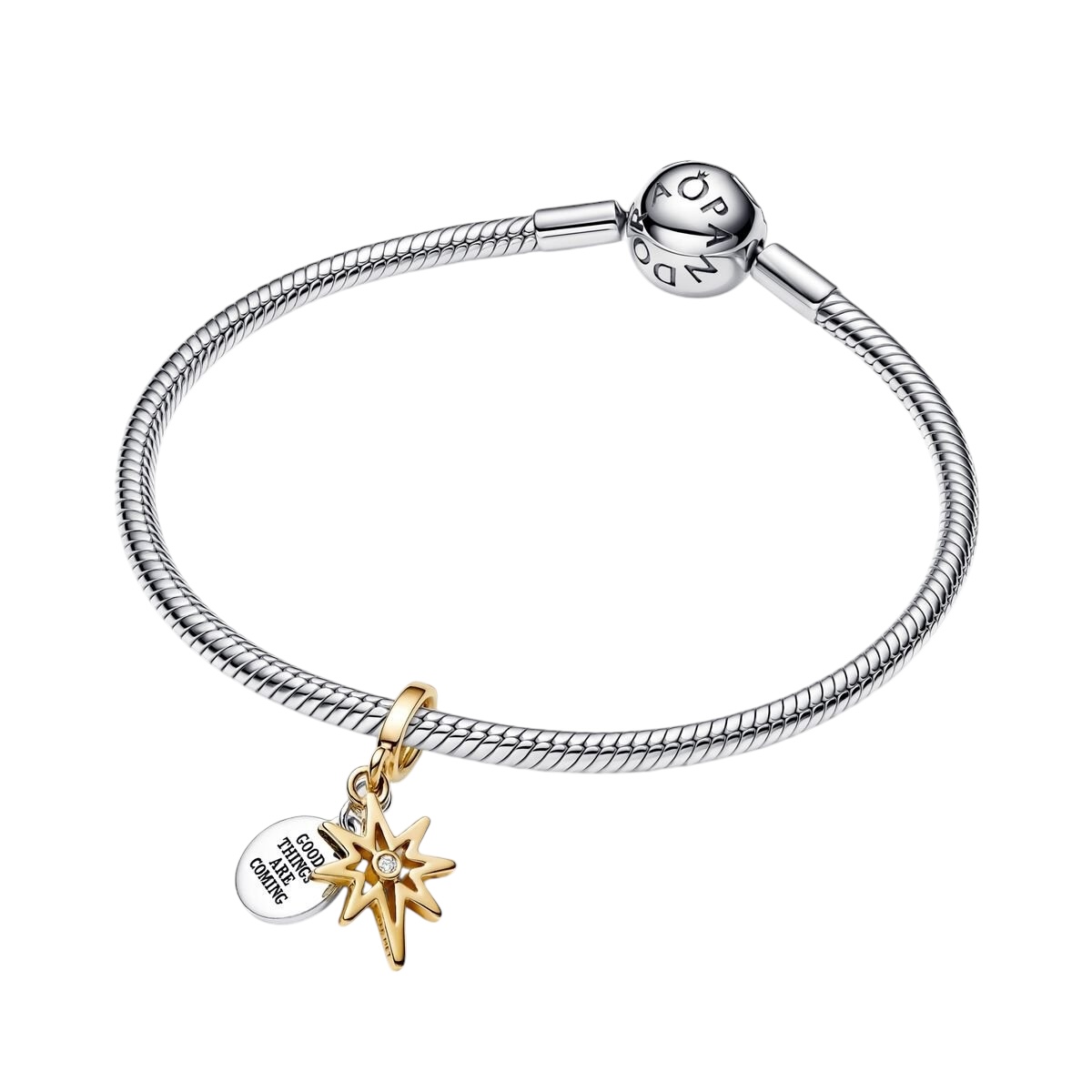 Brilla con intensidad dondequiera que vayas con nuestro Charm Colgante Grabable Estrella Polar con diamante sintético creado en laboratorio. Un charm de la Estrella Polar con recubrimiento en oro de 14k que irradia un cálido brillo y un deslumbrante diamante creado en laboratorio con engaste en bisel en el centro. Junto a la Estrella Polar cuelga un disco en plata de primera ley en el que se ha grabado la inscripción «GOOD THINGS ARE COMING» (Lo bueno está por llegar, en español) en un lateral y un lienzo en blanco en el otro, listo para que grabes tu mensaje personal.