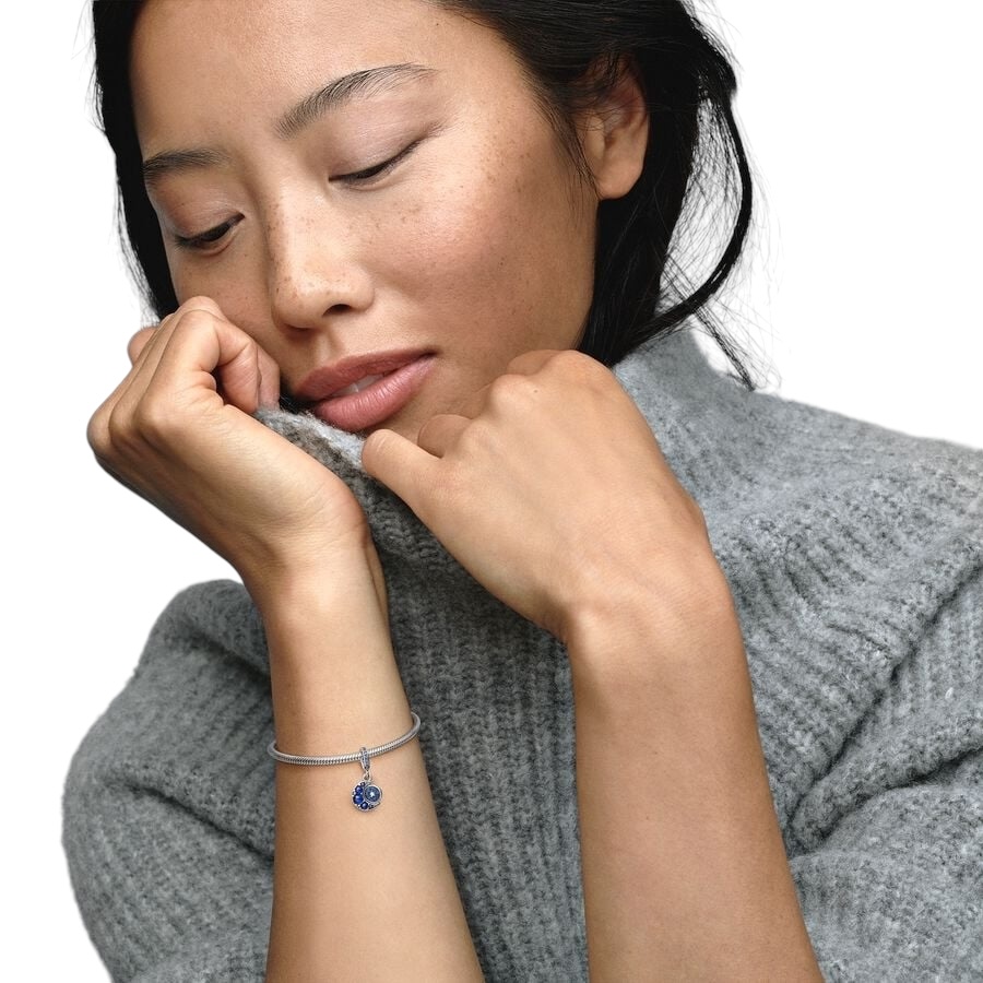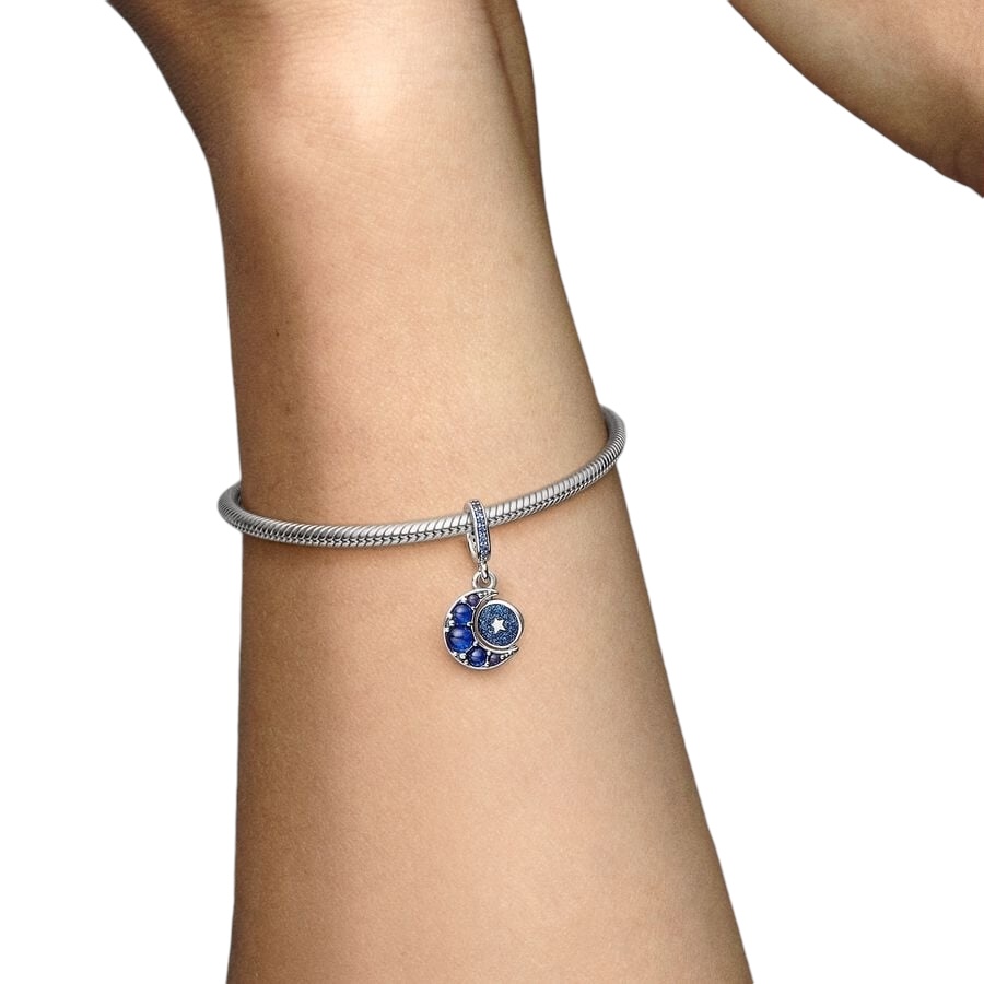 Brillantes gemas de color azul y un bello esmalte se combinan en el Charm Colgante Giratorio Luna Brillante. Este charm presenta una forma de luna creciente embellecida con cristales sintéticos lisos con talla cabujón en tres tonos diferentes de azul que crean un efecto de ensueño. El pequeño disco en plata de primera ley en el interior de la curva de la luna se ha diseñado para girar y se ha decorado con brillante esmalte por un lado y la inscripción «Dreams come true» (Los sueños se hacen realidad) en el otro. Lleva este charm colgante en plata de primera ley para inspirarte a seguir tus sueños, todos los días.