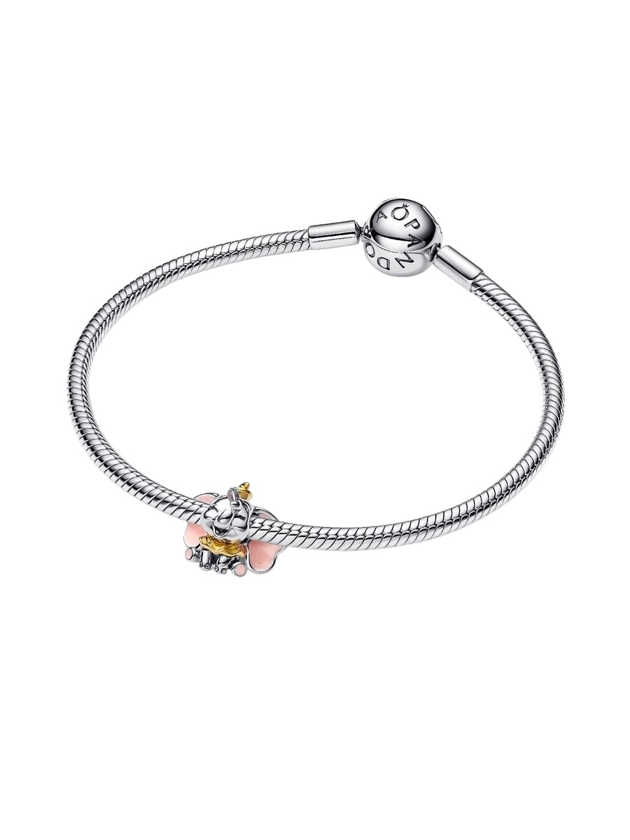 Vuela con Dumbo de Disney. Este charm en plata de ley con recubrimiento en oro de 14k combina esmalte brillante, una pluma mágica y la entrañable sonrisa de Dumbo, un símbolo de valentía, autenticidad y confianza en uno mismo.