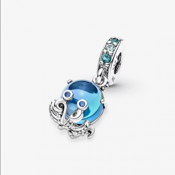 Explora el maravilloso mundo del profundo océano azul y lleva este bonito charm de un pulpo con tus joyas de Pandora Moments. Este charm colgante presenta un bonito cristal de Murano en dos tonos, verde y azul, con un diseño en filigrana ondulado en la parte trasera en plata de primera ley. Los tentáculos, en plata de primera ley, se enroscan y muestran la naturaleza juguetona de esta amistosa y misteriosa criatura oceánica. Los cristales sintéticos en tres tonos de azul aportan brillos en la anilla y en los ojos del pulpo.