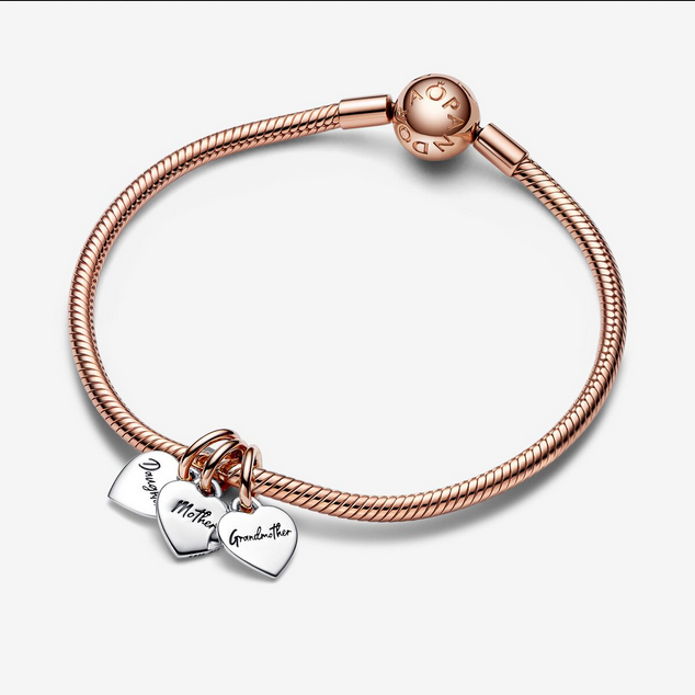 Rinde homenaje a las generaciones de amor con el Charm Colgante Divisible Triple Corazones Generación Familia. Este charm se compone de tres charms individuales con forma de corazón en plata de ley y 3 anillas con recubrimiento de oro rosa de 14k. Cada uno está grabado con un miembro diferente de la familia: «Abuela», «Madre» e «Hija». Divídelo entre las tres y llevadlo cada una como un mensaje de amor entre generaciones, vayas donde vayas.