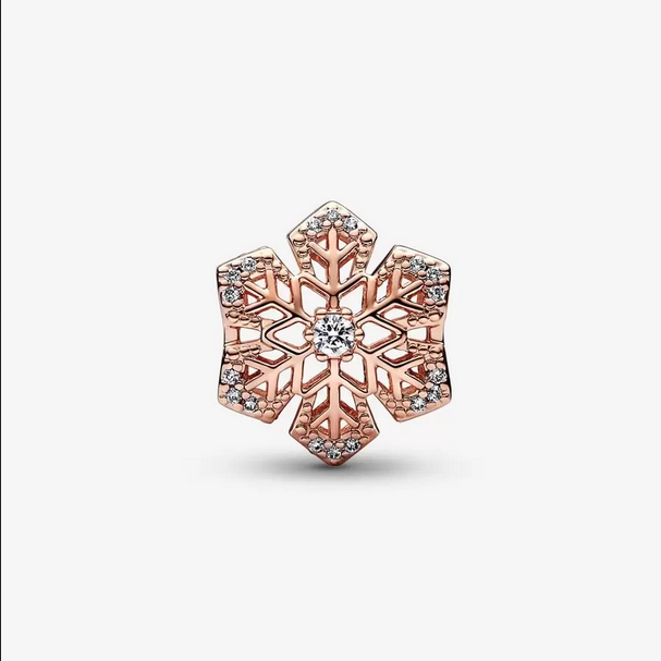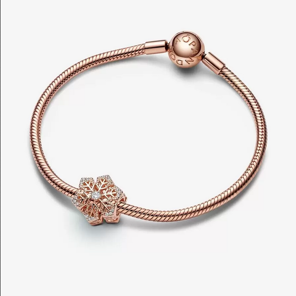 Eleva tus looks inspirados en el invierno con el Charm Copo de nieve Festivo. Con un intrincado diseño en filigrana de copos de nieve con un elegante recubrimiento de oro rosa de segunda ley de 14 k, esta joya celebra el simbolismo del motivo de copo de nieve, cada copo es especial, al igual que tú y tus seres queridos. El charm se presenta con una circonita cúbica central a cada lado y 36 circonitas cúbicas con micro engastes en grano que le aportan un brillo escarchado. Una joya delicada y significativa para tu colección de joyas de temporada.