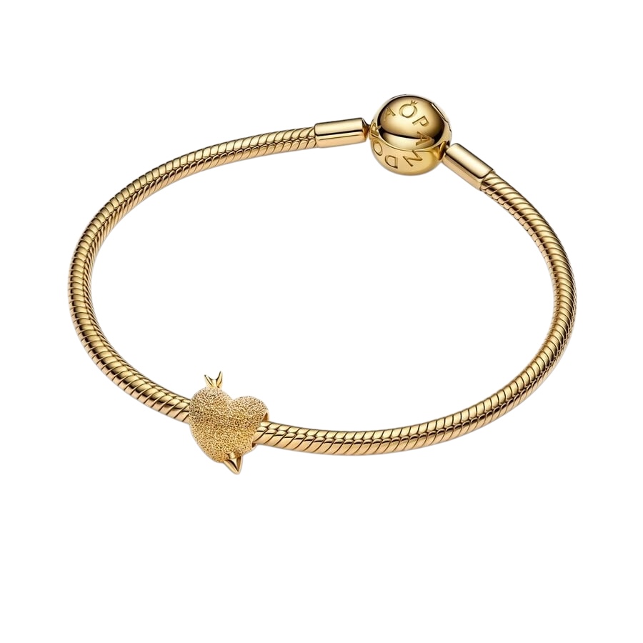 ¿Buscas un corazón de oro? Enamórate de nuestro Charm Corazón de Cupido con un brillante recubrimiento de oro de 14k y acabado a mano que se ha decorado con la flecha característica de Cupido atravesándolo. La textura de la superficie del corazón se ha creado con la técnica de puntas de diamante que también aporta dimensión. Por favor, recuerda: este charm es más pequeño que los charms estándar de Pandora Moments.