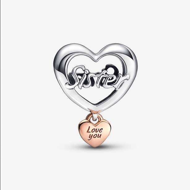 Este charm rinde un homenaje a tu hermana y a la alegría que trae a tu vida. Un corazón grabado con un recubrimiento electrolítico de oro rosa de segunda ley de 14k que cuelga de un corazón en plata de primera ley, con la inscripción «Sister» (Hermana). Lleva este charm para que tu hermana sepa lo mucho que significa para ti.