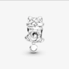 Charm Gatito y Ovillo de Lana. Acabado a mano en plata de primera ley, este charm presenta a un gatito con detalles grabados y líneas acanaladas que imitan las manchas de la piel, y el detalle de una pata alzada. El gatito sostiene un ovillo de lana con una pequeña etiqueta colgante con la inscripción “ME❤W” (Miau) en un lateral y el logo de Pandora en el otro. Quizás no puedas llevarte a tu gatito a todas partes, pero este charm es la mejor alternativa.