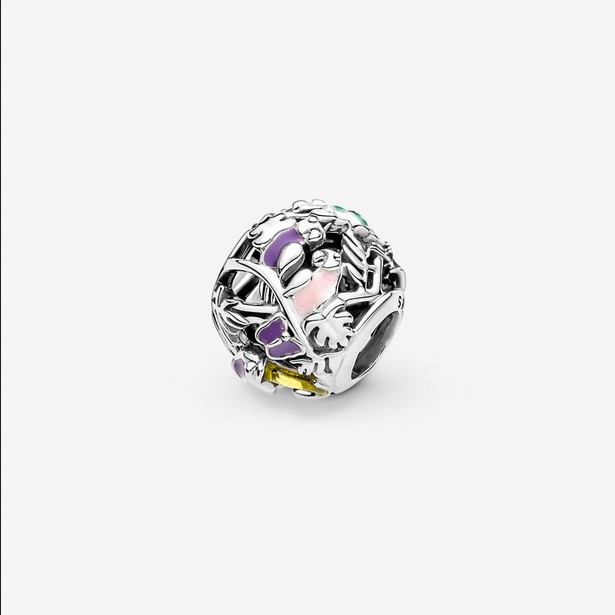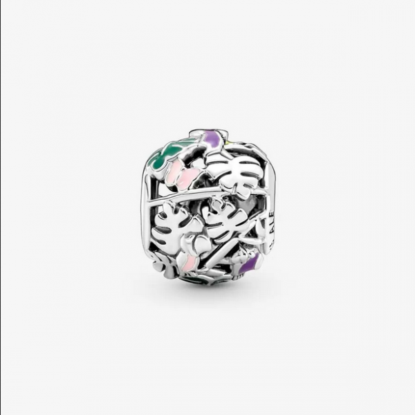 ¡Bienvenido a la jungla! Mira entre las grandes hojas tropicales y descubre pájaros y mariposas de colores. Este charm en filigrana en plata de primera ley presenta un intrincado diseño de hojas y animales de la jungla resaltadas con esmalte aplicado a mano. Llévalo en tu pulsera y sueña con un frondoso paraíso verde.