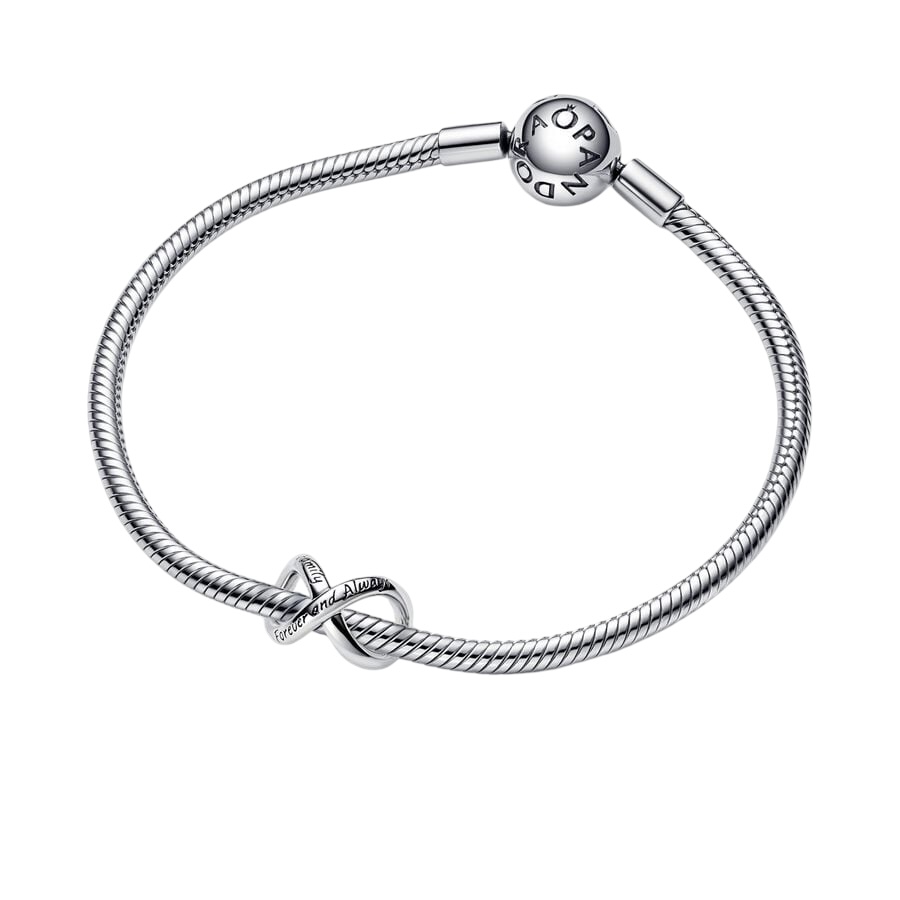 Lleva contigo vínculos eternos con nuestro Charm Infinito Para Siempre, un diseño único acabado a mano en plata de primera ley. Revelando la esencia de la familia, esta charm forma un elegante símbolo del infinito que refleja la naturaleza atemporal de esas conexiones preciadas. Este charm del infinito de Pandora captura el espíritu perdurable de la familia, que se refleja a través de dos palabras grabadas, «Family» y «Forever and Always» (Familia y Por Siempre y Para Siempre, en español, respectivamente). Permite a este charm recordarte que la familia es para siempre y que la alegría que se encuentra en su compañía es ilimitada.