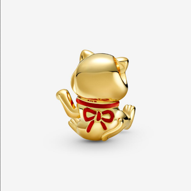 Charm Lindo Gato de la Fortuna. Acabado a mano, este diseño con un recubrimiento de oro de 14 K se basa en el Maneki Neko, un símbolo de la buena fortuna en la cultura china y japonesa. Las orejas, cara, garras, collar y lazo del gato presentan detalles de esmalte en color rojo aplicado a mano. Además, se ha embellecido con la inscripción del ideograma chino correspondiente a ‘Fortuna’ en esmalte de color negro aplicado a mano. Usa este charm con otros símbolos de la buena suerte para atraer buenas vibraciones este año y los que vienen.
