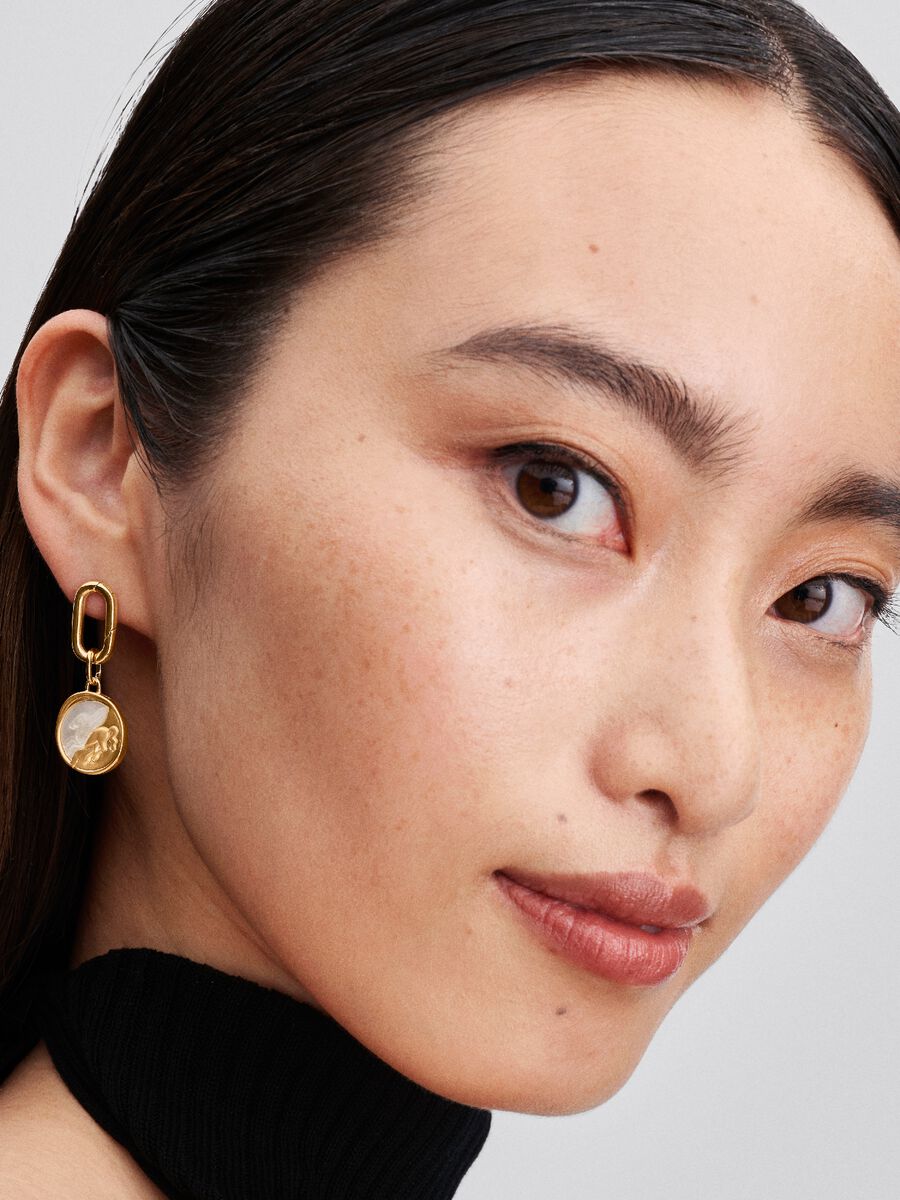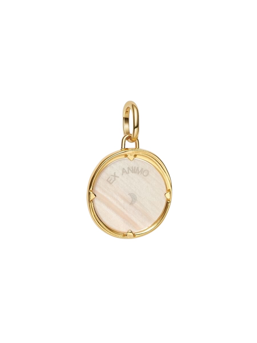 El amor está en los detalles con recubrimiento en oro de 14k. Un medallón mítico realizado con un nuevo acabado nacarado. Con Pegaso en el anverso y la inscripción en latín «EX ANIMO», «DESDE EL CORAZÓN» en el reverso, has encontrado tus alas.
