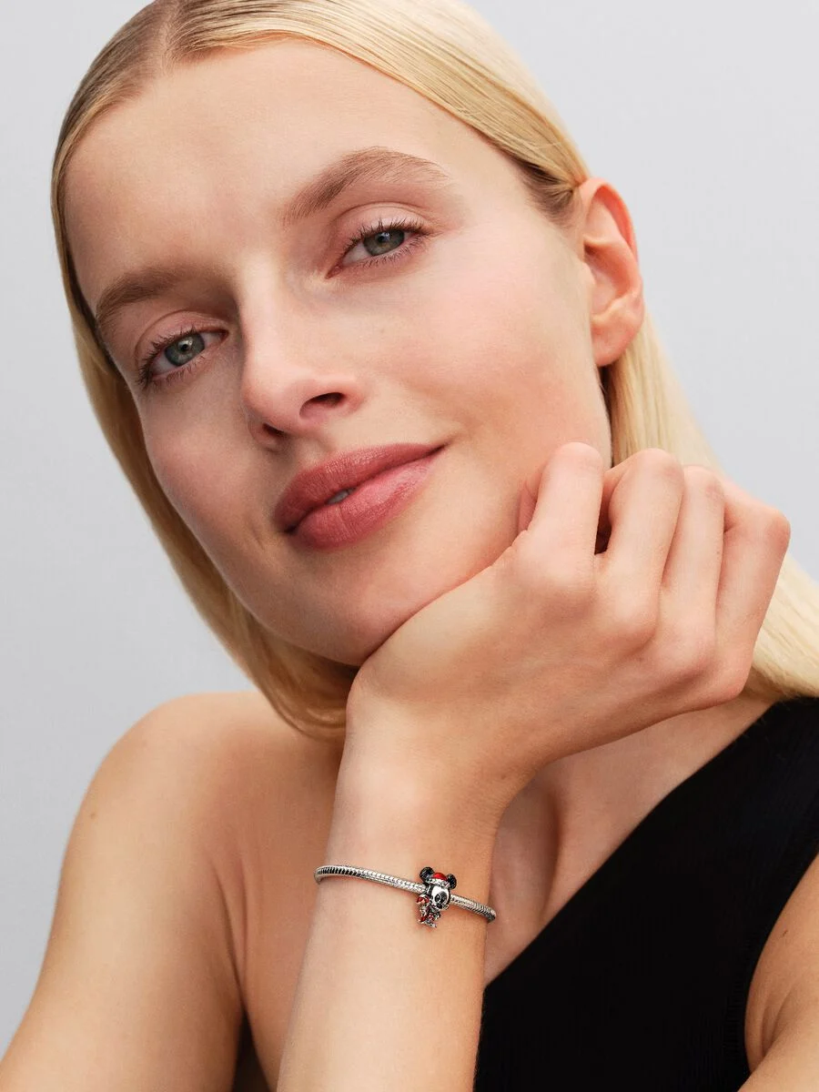Sumérgete en el espíritu navideño con Mickey Mouse de Disney. Llevando un sombrero de Papá Noel y sosteniendo un bastón de caramelo, este charm en plata de primera ley se presenta adornado con llamativo esmalte y detalles intrincados, un icono navideño de alegría.
