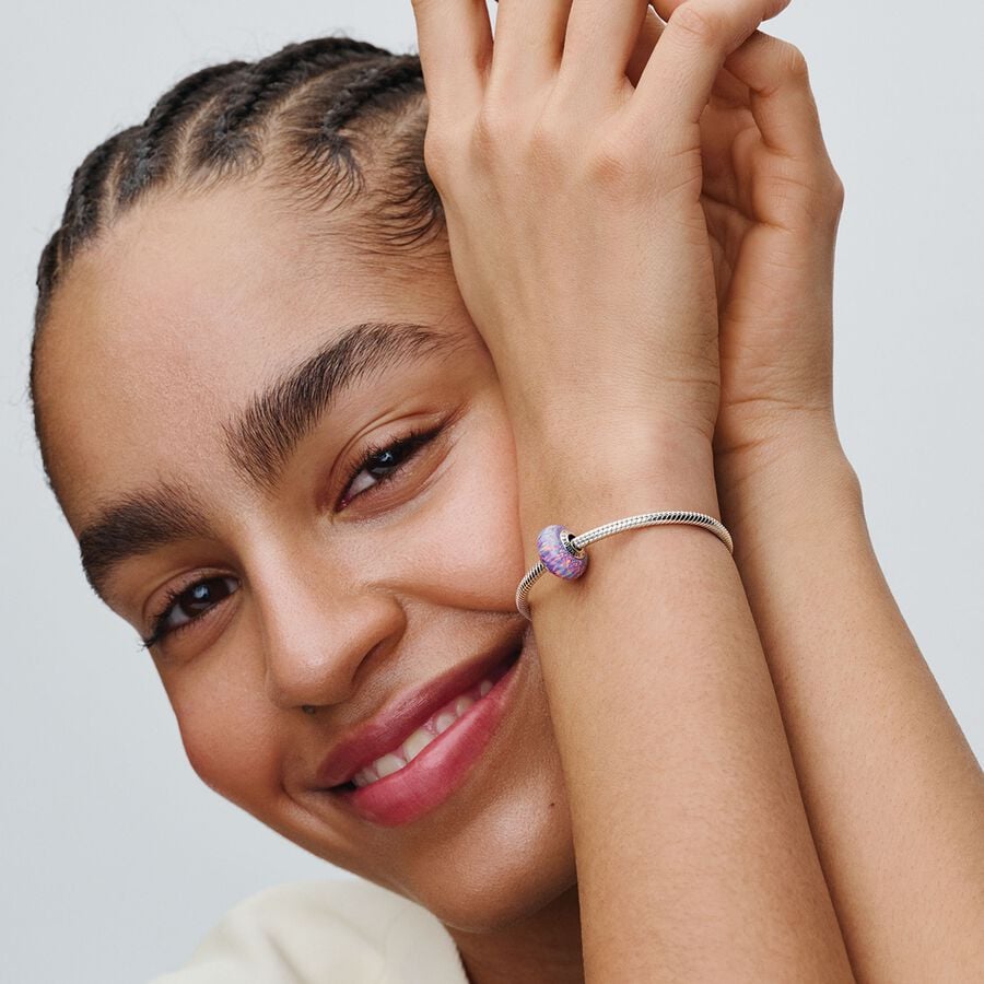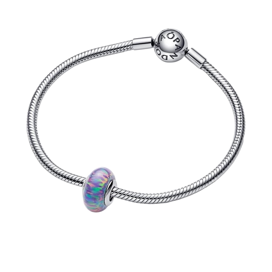 Crea tu propio momento de resplandor de amor con un toque de morado opalescente. Nuestro charm ópalo creado en laboratorio tiene un núcleo de plata de primera ley y brilla con un espectro de colores y rayas de purpurina.