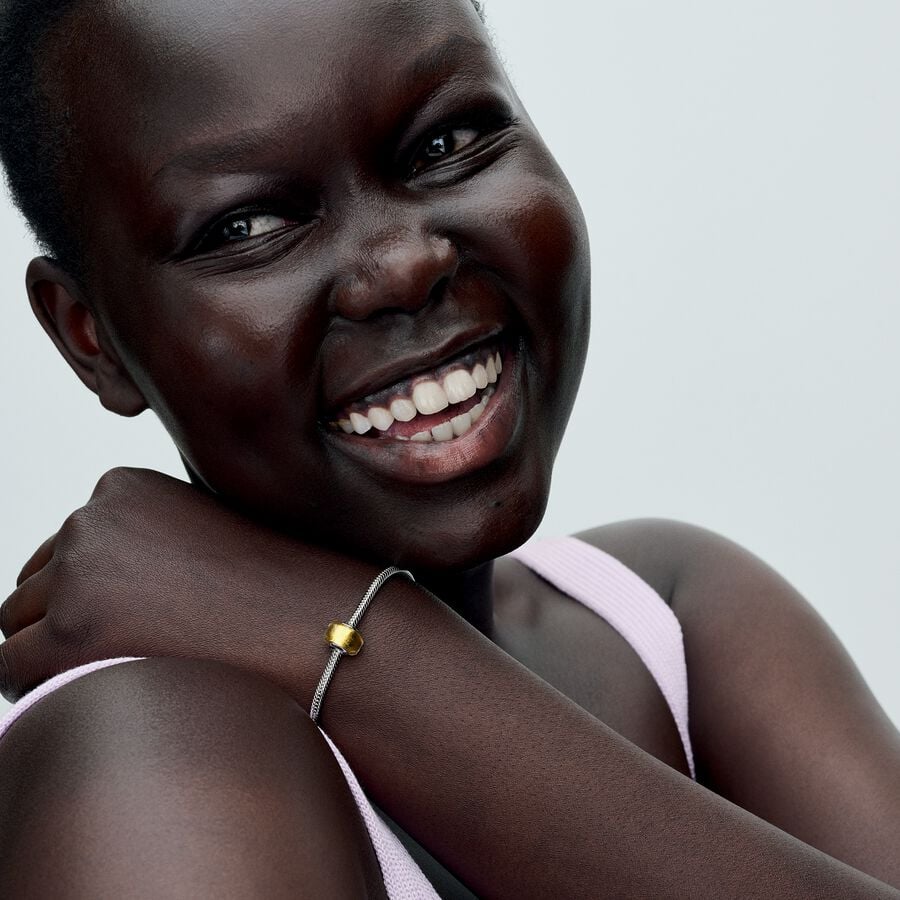 Un diseño clásico se actualiza con un tono dorado en el Charm Mini Cristal de Murano Dorado. La brillante lámina de oro de 24k que envuelve el núcleo de plata de primera ley de este charm es visible a través del cristal de Murano transparente, creando un efecto en dos tonos. Uno de los laterales del núcleo se presenta con el logotipo de Pandora grabado. Diseñado en un tamaño ligeramente reducido y con un perfil cuadrado, este charm es delicado y versátil, un complemento sencillo a cualquier otro tono metálico con el que lo combines.