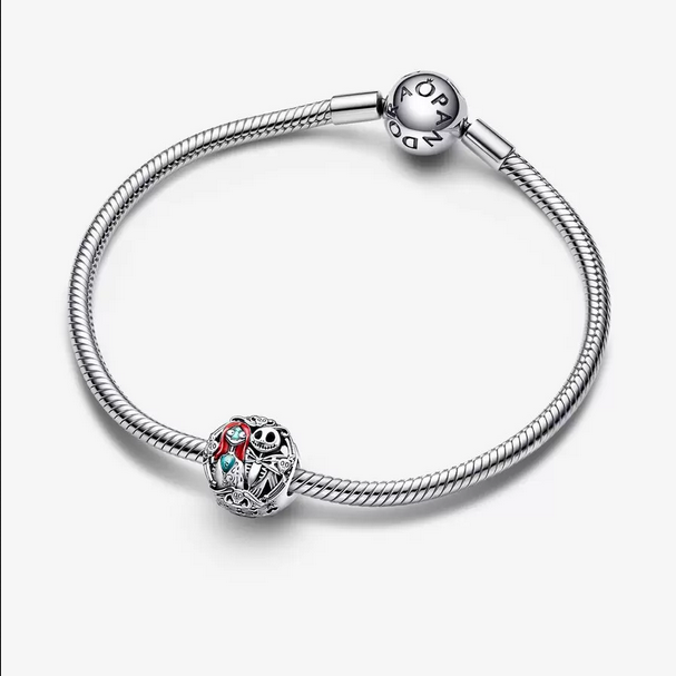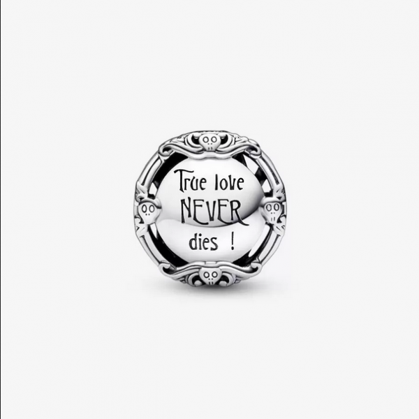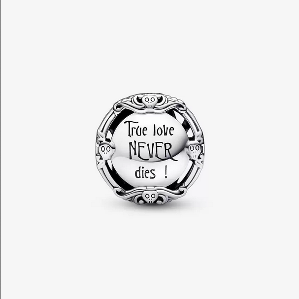 ¡Feliz Halloween! Celebra la época más espeluznante del año con un charm especial inspirado en Pesadilla antes de Navidad de Tim Burton de Disney. Acabado a mano en plata de primera ley, presenta en un lado a Sally y Jack Skellington de Disney y la inscripción «True love NEVER dies» en letras góticas por el otro (El amor verdadero NUNCA muere). Añade al rey y la reina de Halloween a tu porta charms favorito y celebra el amor eterno.