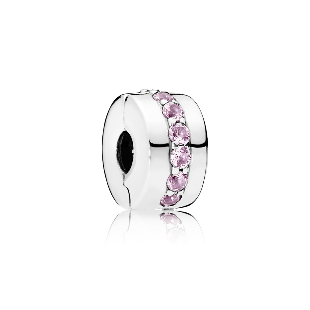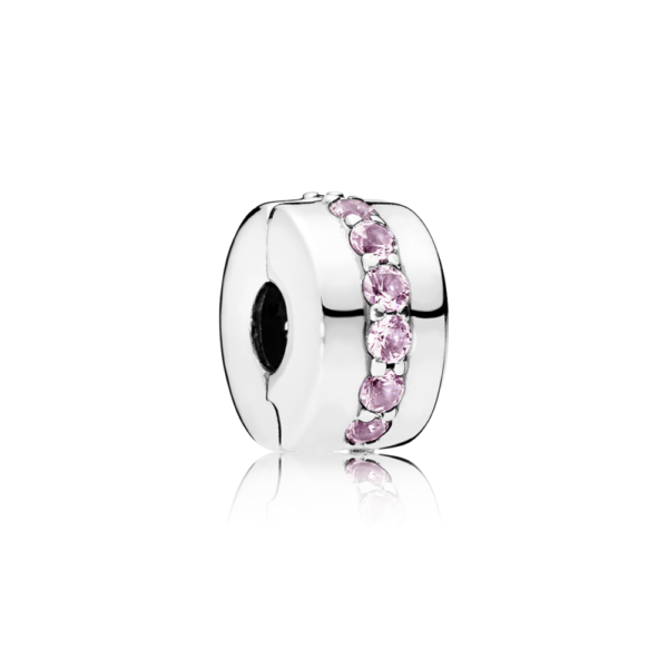 . Este nuevo clip en plata de ley contiene una sola hilera de brillantes circonitas cúbicas rosas y resulta el foco de atracción para iluminar tu Pulsera.
