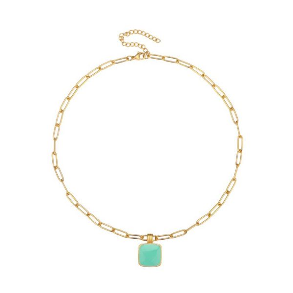 Collar eslabones en acero con baño de oro de 18k y colgante cuadrado con circonita color aguamarina