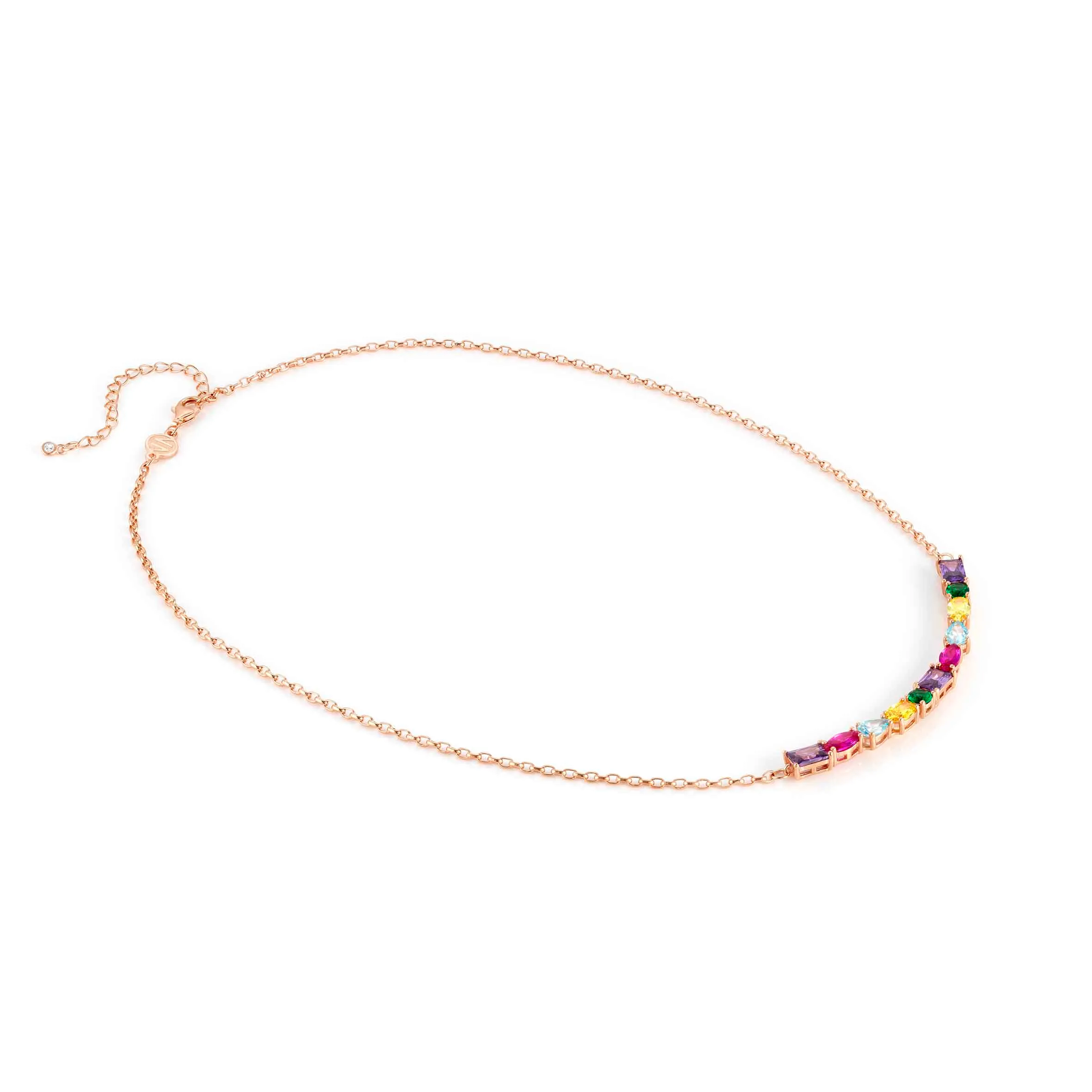 Collar en Plata de Ley 925 con acabado en Oro Rosa y Cubic Zirconia de colores. Cada piedra tiene un corte particular: aguamarina talla pera, amarillo citrino talla oval, verde esmeralda talla redonda, rosa talla marquesa, violeta amatista talla baguette. Medida: 46 cm ajustable a 40 cm. Tamaño piedra máx. 0,7×0,4 cm. Cierre con Cubic zirconia. Made in PRC. Una ola de colores para lucir todo el año.