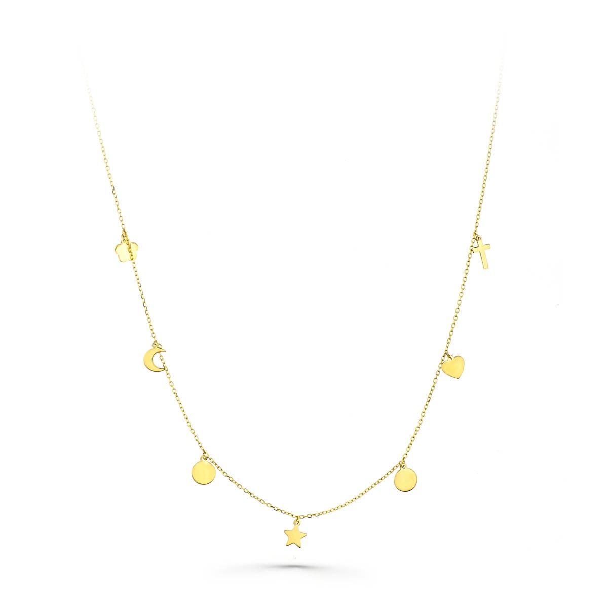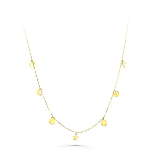 Gargantilla en oro amarillo de 18k con de 42cm ampliable a 45cm con 7 motivos intercalados colgantes Flor, luna, circulo, estrella, circulo,corazón y cruz de 5mm