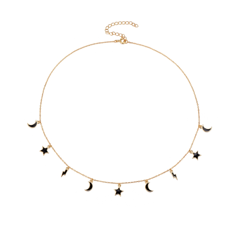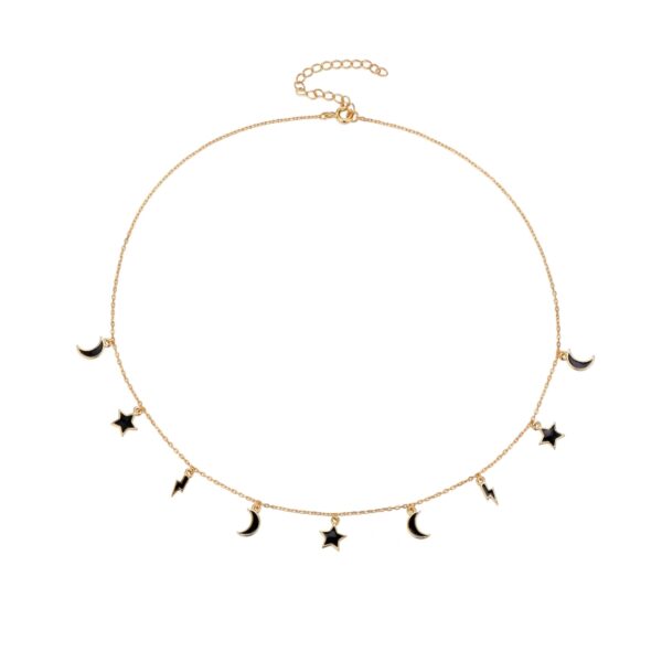 Collar en plata de ley con baño de oro de 18k y 9 colgantes luna, estrella, rayo con esmalte turquesa