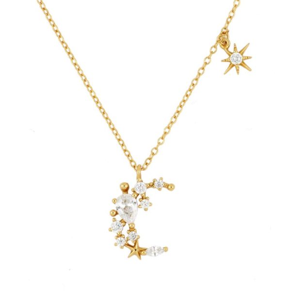 Collar en plata de ley con baño de oro de 18k de 38cm ampliable a 40,5 y 43cm con colgante Luna de 16mm formada por circonitas de diferentes formas y colgante estrella en la cadena