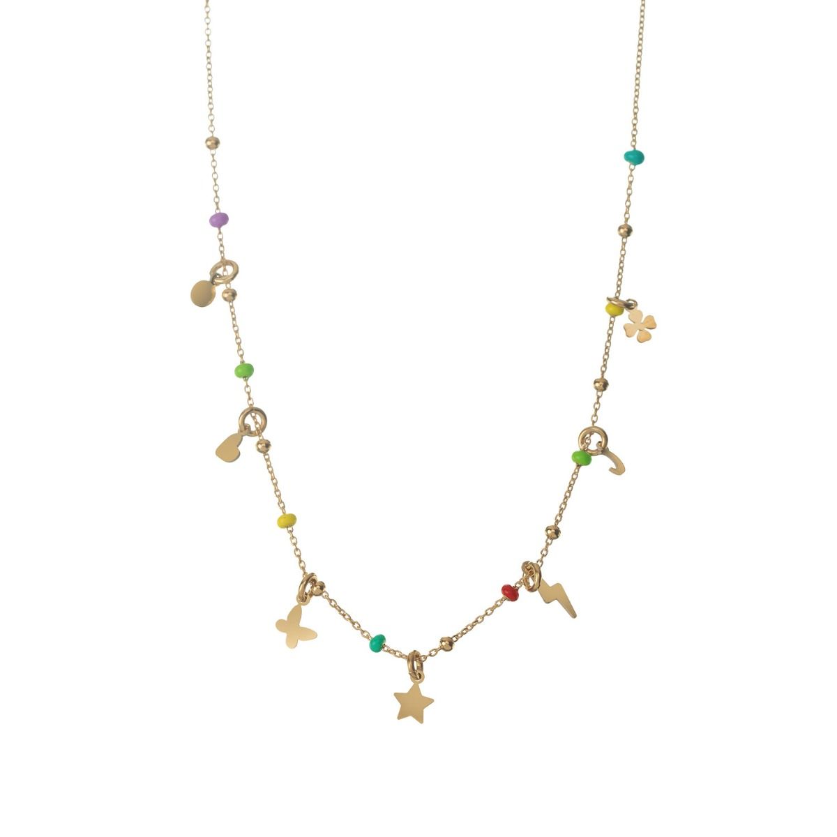 Collar en plata de ley con bolitas esmaltadas y 7 charms colgantes ( trebol, luna, rayo, estrella,mariposa, corazón, circulo)