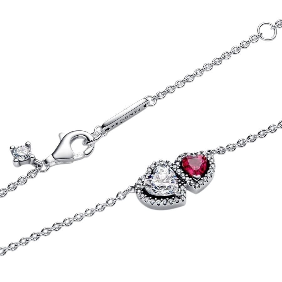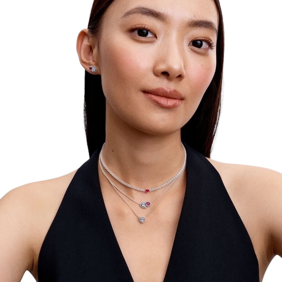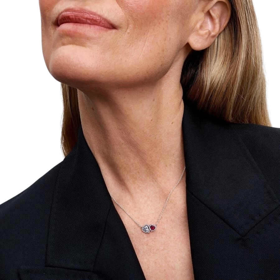 Lo que quiere el corazón. El Collar Halo Corazones presenta dos corazones conectados que simbolizan el amor profundo. Creado en plata de primera ley, este diseño se presenta con un cristal artificial de color rojo con talla con forma corazón y una circonita cúbica transparente con talla clon forma de corazón rodeada de brillantes gemas engastadas en pavé. Con una cadena de cable ajustable (45 cm, 41,5 cm y 38 cm), es perfecto para combinar o llevarlo solo para darle un toque romántico a tu look.