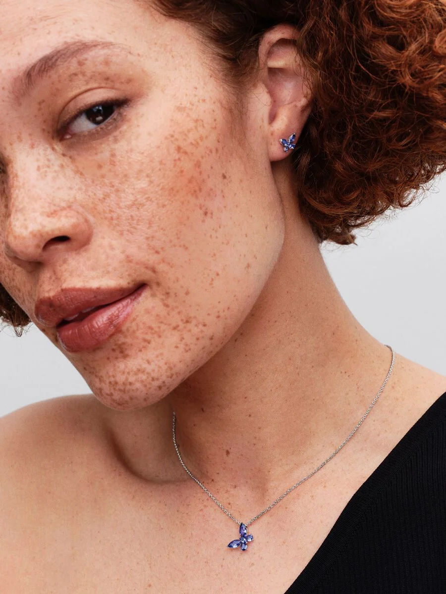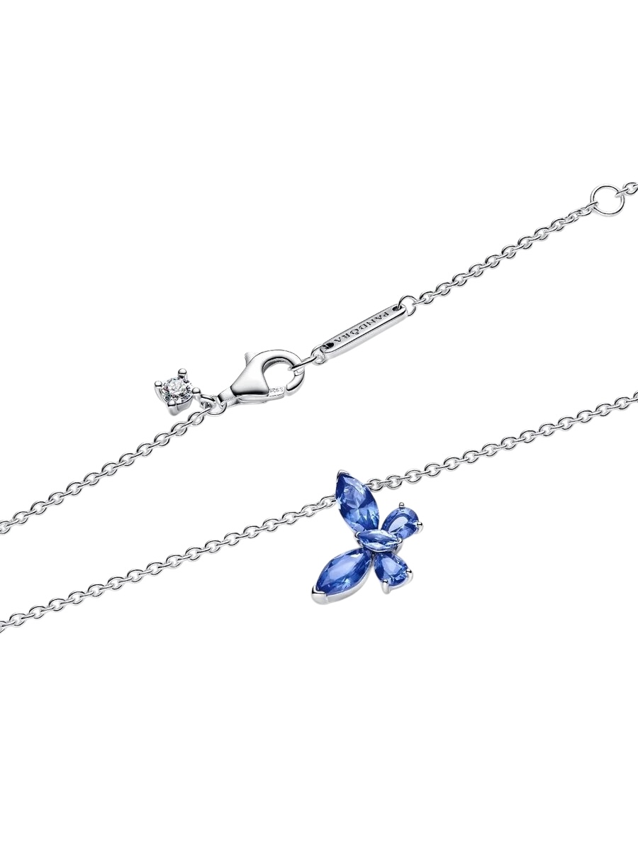 Extiende tus alas y transforma tu look con este collar en plata de primera ley. Adornado con cristales sintéticos de color azul con talla marquesa y forma de pera, una mariposa cuelga graciosamente de su cadena.