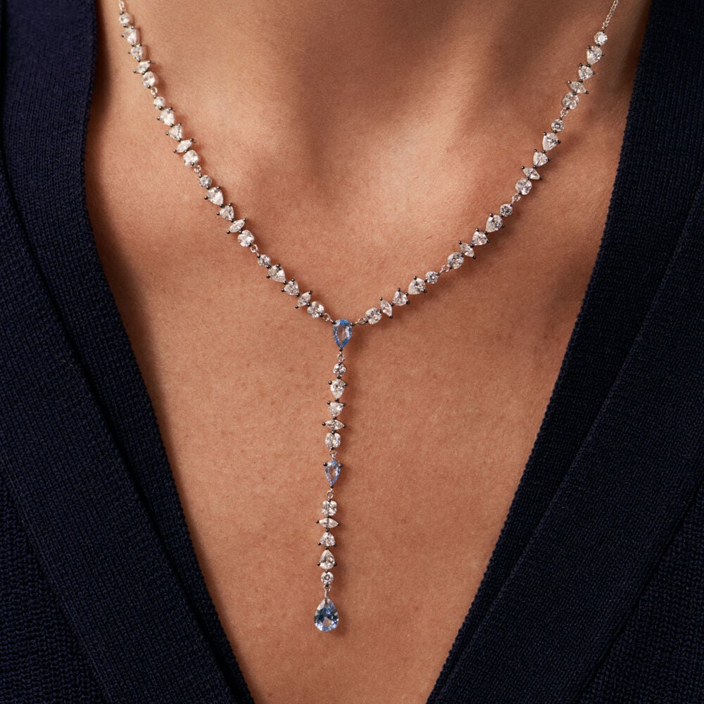 Pendientes largos de plata de ley con tira de circonitas de distintas formas en color cristal y una de color azul aguamarina en el centro. Un súper diselño que dará el twist definitivo a cualquiera de tus outfits, atraparás todas las miradas. Esta joya pertenece a la selección de los favoritos de Paula.