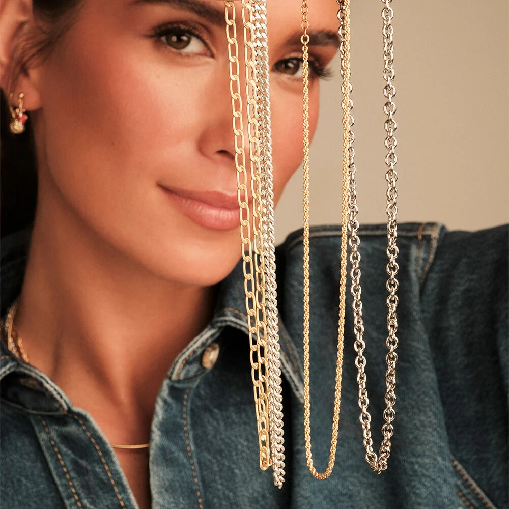 Cadena de eslabones rectangulares de 50cms de largo. Una malla intemporal e ideal para lucir tus colgantes de la suerte. Crea tu collar personalizado con los amuletos de moda de la nueva colección de Maria Pombo X AGATHA. Joya acabada en oro.