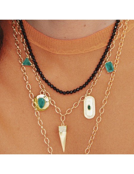 Collar Mirin acabado en oro amarillo de 18 Quilates. Además de lograr estilismos para trotar por el mundo, los diseños de la línea de AFRICA Fantasia marcan la diferencia y consiguen que esa diferencia sea radical. Diseños realizados cuidadosamente a mano con piedras multicolor, turquesas y perlas, dan vida a unas sofisticadas joyas. Su exotismo solo es comparable con su recato. Intuitiva, ponderada acierta cada vez que te lo pones y representa como pocas el carácter urbano más cosmopolita: BE AUTHENTIC (NOT) UNIQUE. Largo: 40cm + 3cm de extensión